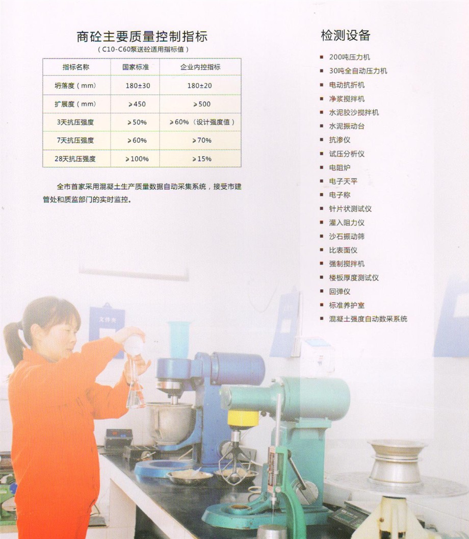 公司設(shè)有先進(jìn)的實(shí)驗(yàn)室,配備全套混凝土及原材料檢測試驗(yàn)設(shè)備,配有專職的試驗(yàn)、檢驗(yàn)人員,可承擔(dān)混凝土的材料性能試驗(yàn),工藝質(zhì)量控制、產(chǎn)品質(zhì)量檢驗(yàn)等全部試驗(yàn)、檢驗(yàn)項(xiàng)目,為確保混凝土質(zhì)量提供了可靠的保證。